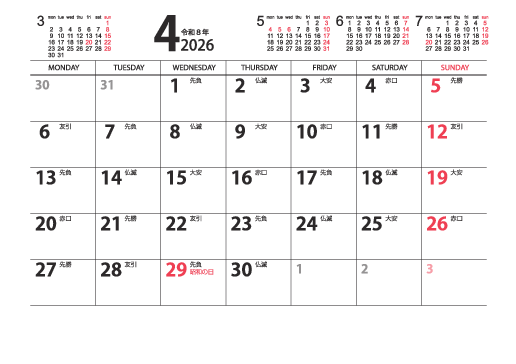 お好きな順に並び替えができる、組み替えタイプの便利な3か月カレンダー