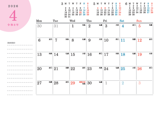 お好きな順に並び替えができる、組み替えタイプの便利な3か月カレンダー